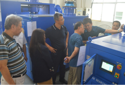 在五楼空气悬浮风机技术中心,嘉宾一行参观了雷茨空气悬浮风机的轴承、叶轮、电机等核心组件的研发、测试、装配工艺流程。吴总结合空气悬浮风机的内部结构,现场向嘉宾展示了雷茨风机轴承的材质和工艺特色、电机的性能,叶轮等组件的材质和工艺特色。值得一提的是,嘉宾在现场看到雷茨技术工人也正在维修韩国某品牌的风机机头,雷茨可以维修世界各大品牌风机,也包括国产的风机,最大程度减省客户的维修成本。